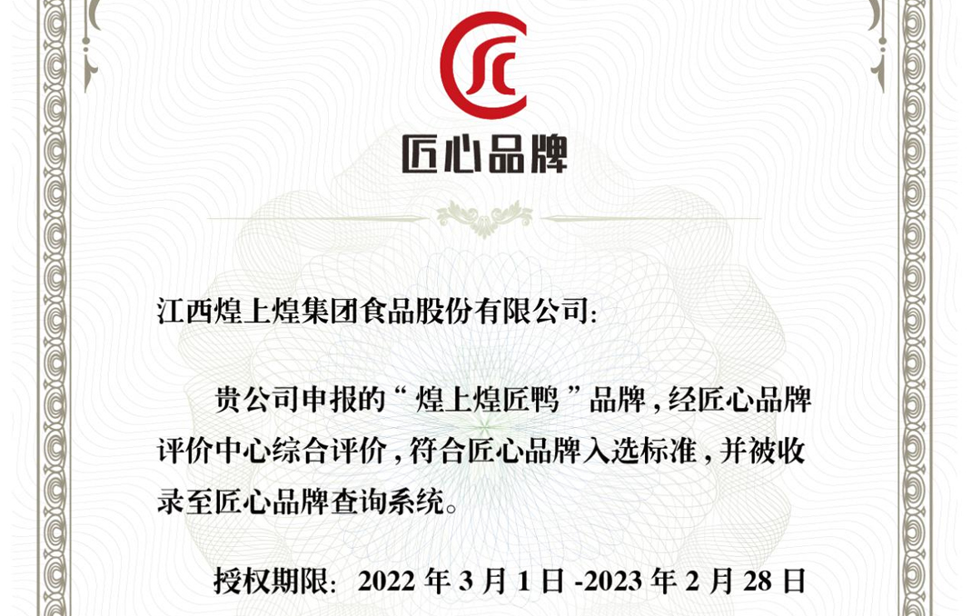 近日,“煌上煌匠鴨”品牌經(jīng)匠心品牌評(píng)價(jià)中心綜合評(píng)價(jià),符合匠心品牌入選標(biāo)準(zhǔn),并被收錄至匠心品...