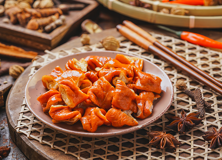 產品介紹:選用精處理后的豬大腸,再度進行預處理去腥臊味,直至腸子內外潔凈無更多的腥臊味和多余的脂肪組織。采用多種香氣味重的重要和香辛料實施專湯專鹵,并長時間泡漬。產品金黃偏紅,色澤油亮,口感酥爛略呈韌性,濃郁的香氣伴有豬腸固有的絲絲的腥臊,賦香與腸子氣味的結合恰到好處,消費者購買后配以辣椒烹炒,是受喜食豬腸的消費者歡迎的產品。