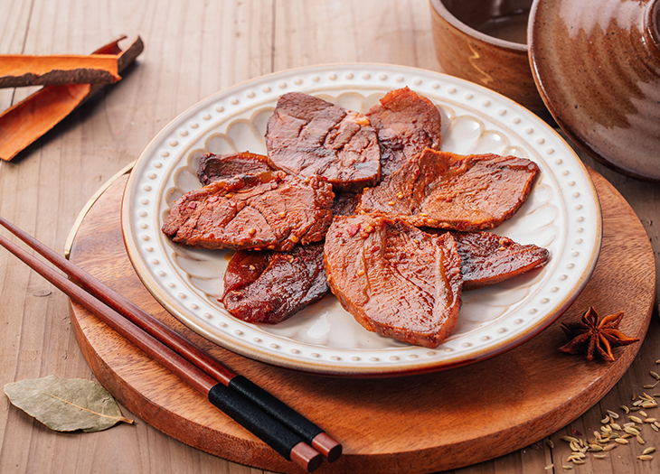 精選牛的肋排肉心,鹵制后切成薄片,拌入辣椒、蒜、姜等香辛料和調...